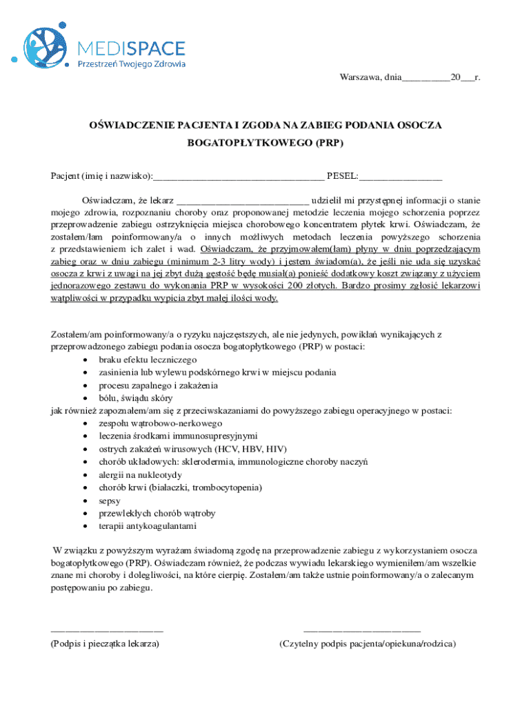 The Patient Consent Form for PRP Treatment is a medical document used by patients and doctors to authorize and consent to Platelet-Rich Plasma treatment in Poland.