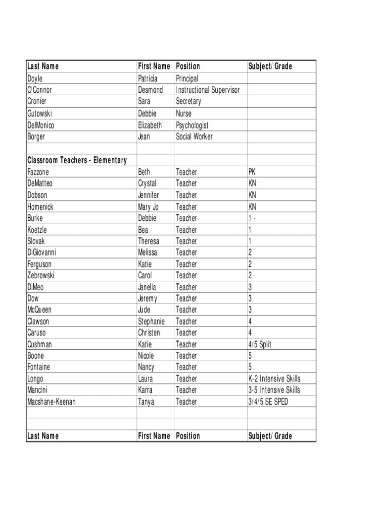 Add the corresponding Position and Subject or Grade that each staff member oversees.