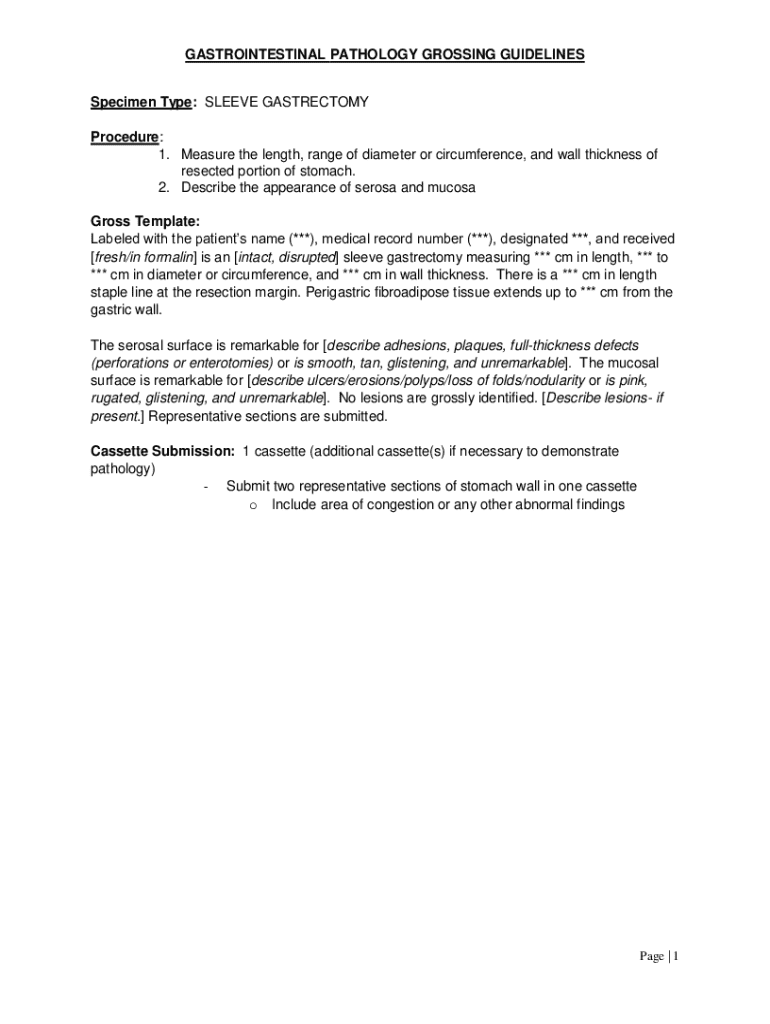 The Gastrointestinal Pathology Grossing Guidelines is a medical form used by healthcare professionals to document the gross examination of a resected stomach specimen, primarily for sleeve gastrectomy.