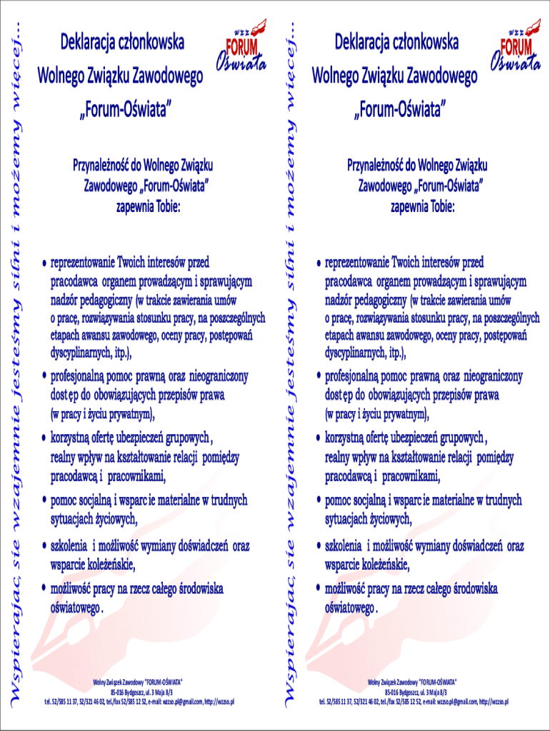 The Wolny Związek Zawodowy Membership Declaration is a legal document used by employees in Poland to declare their membership in the 'Forum-Oświata' trade union.