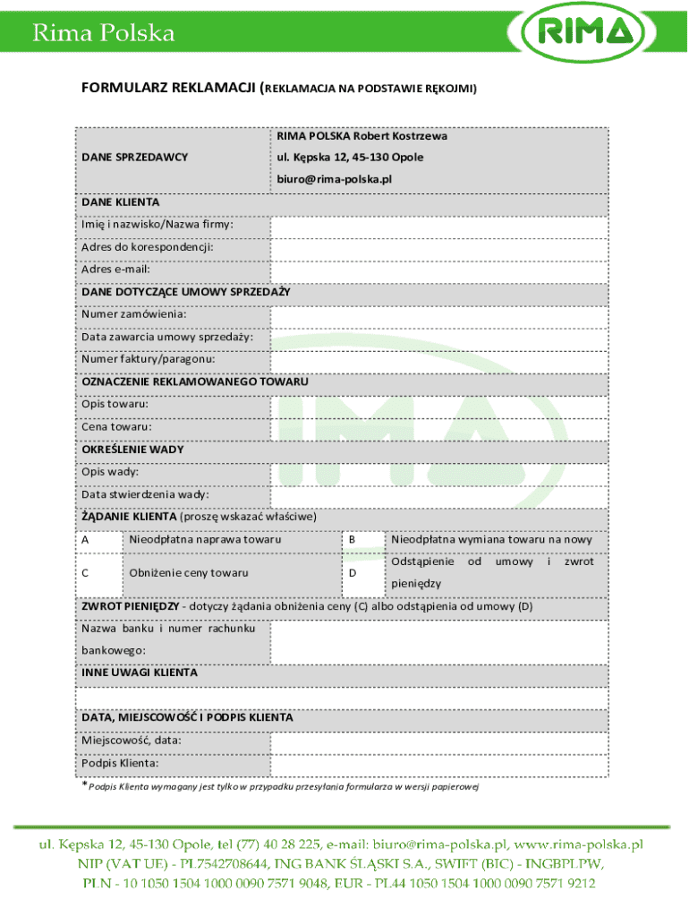 The Poland Complaint Form is a business document used by clients to file warranty-related complaints concerning purchased items.