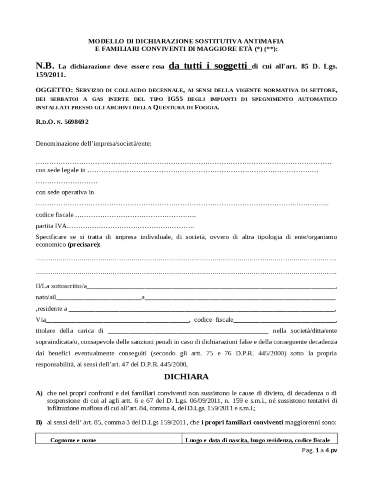Il modulo di Dichiarazione Antimafia Italiana è un documento legale utilizzato dai dichiaranti per certificare l'assenza di divieti mafiosi. È richiesto per ottenere servizi come il collaudo decennale dei serbatoi di gas inerti presso l'Archivio di Polizia di Foggia.