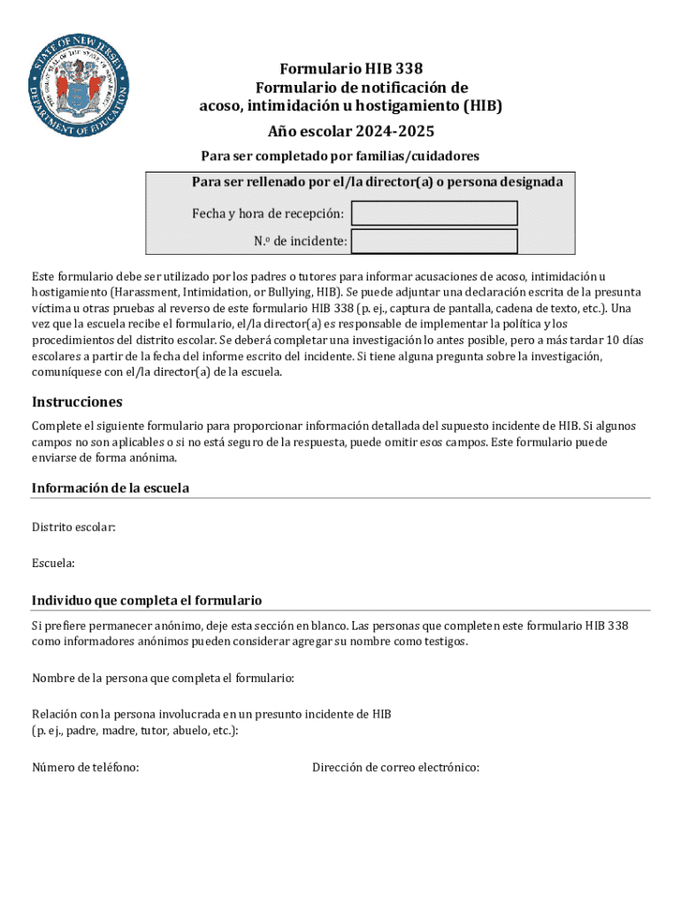 El HIB 338 Form puede ser completado por padres o tutores de los estudiantes que hayan sido víctimas de acoso, intimidación o bullying en la escuela.