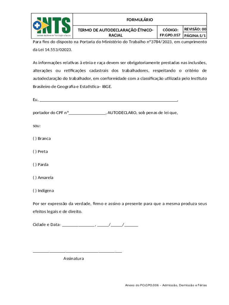 O Formulário de Autodeclaração Étnica é um documento utilizado por empregados no Brasil para declarar suas informações étnicas e raciais como parte de seus registros de emprego.