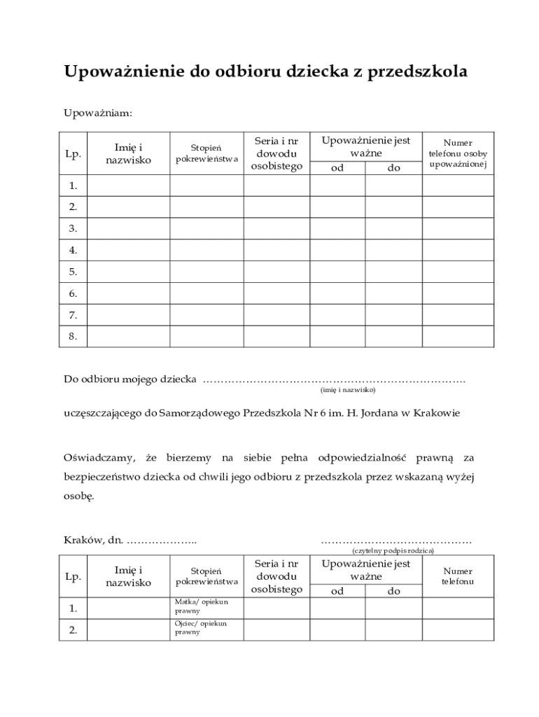 The Child Pickup Authorization Form is a legal document used by parents to authorize a specific individual to pick up their child from preschool in Krakow, Poland.