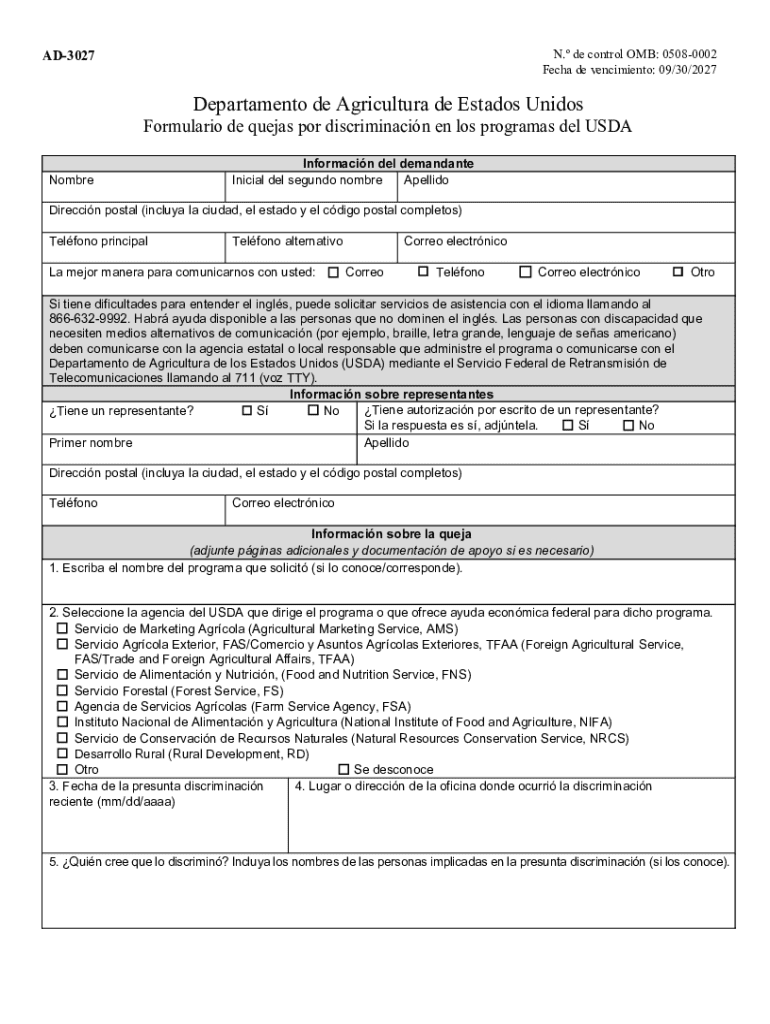 El Formulario de Queja por Discriminación de USDA AD-3027 está disponible en español, lo que facilita su llenado para quienes prefieren este idioma.