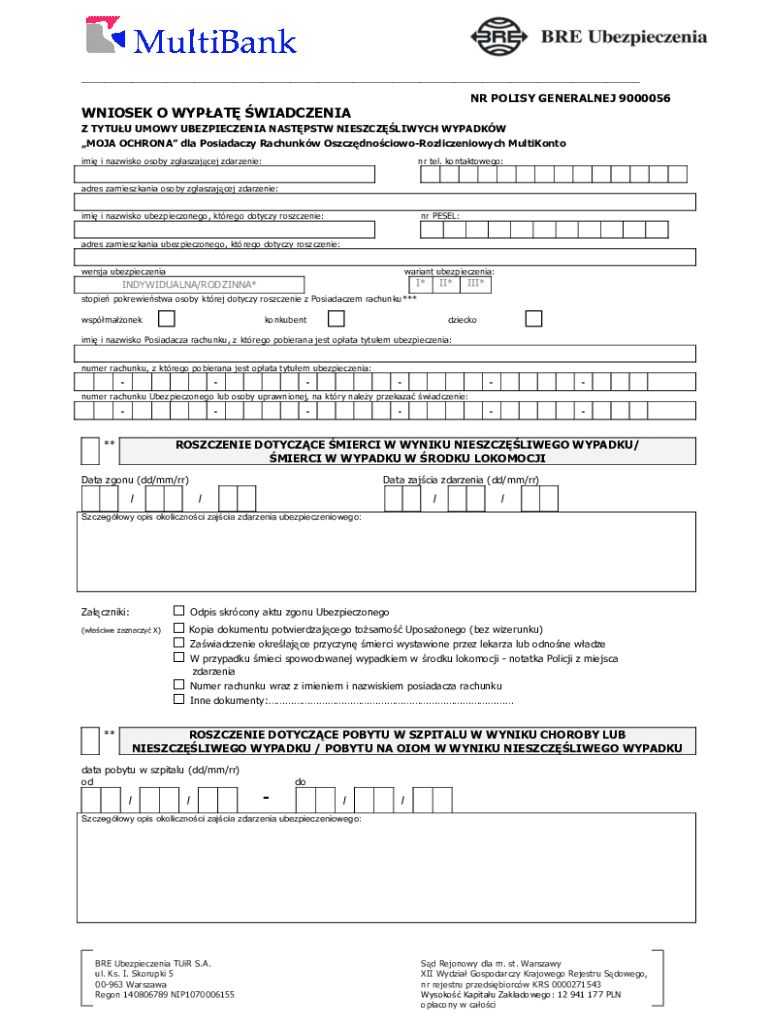 The BRE Insurance Claim Form is an insurance claim document used by MultiKonto account holders to request benefits for accidents.