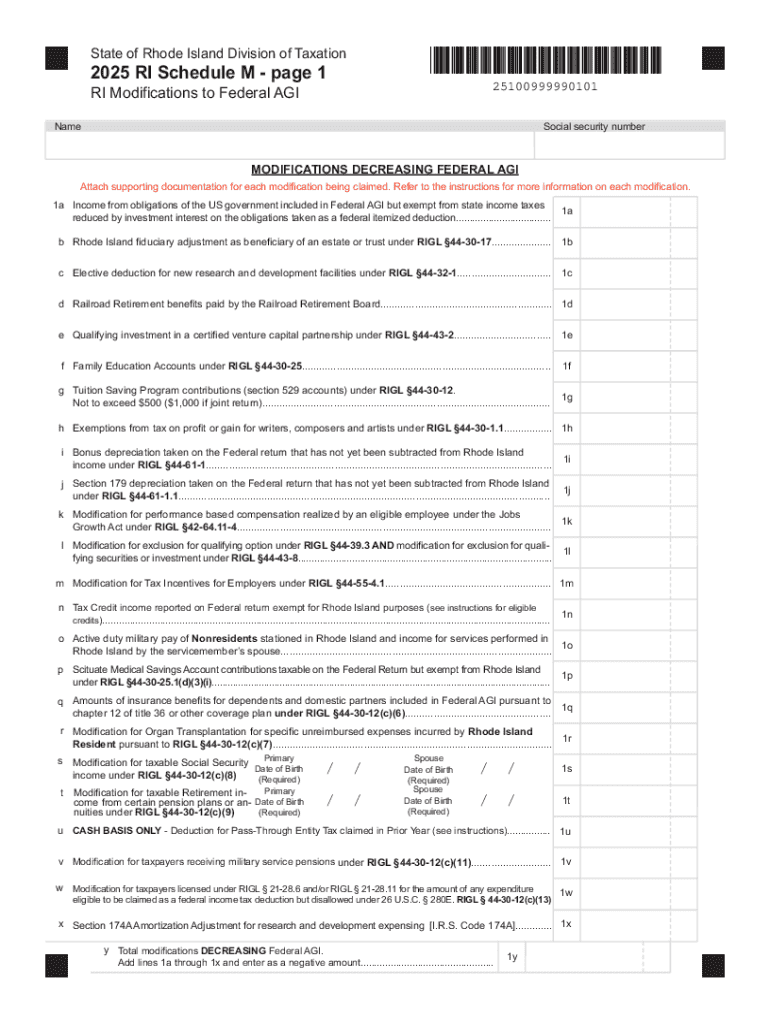 The 2025 Rhode Island Schedule M is a state income tax form used by residents of Rhode Island to report modifications to their federal adjusted gross income (AGI).