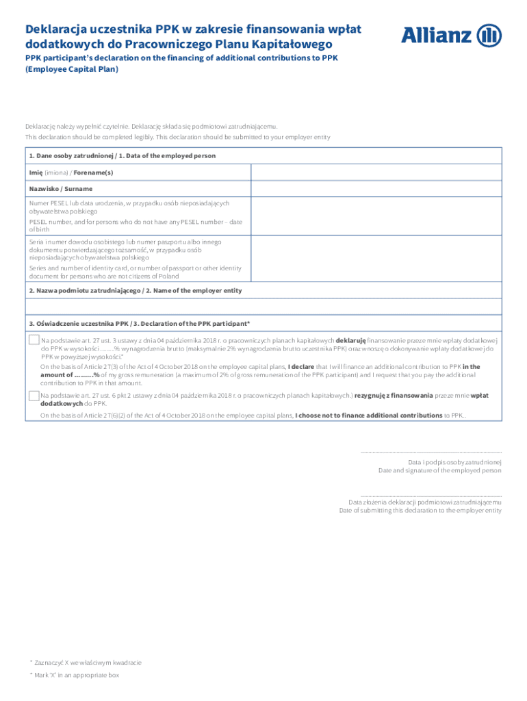 Any employee in Poland who is enrolled in the Pracowniczy Plan Kapitałowy (PPK) can submit the PPK Additional Contribution Declaration to declare their contributions.