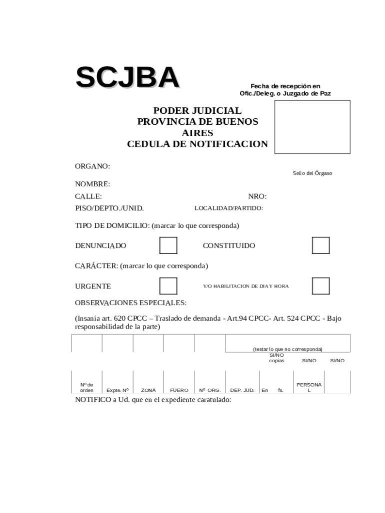 La Cedula de Notificacion es un documento legal utilizado por un oficial notificador para informar formalmente a un individuo sobre un procedimiento judicial en la Provincia de Buenos Aires, Argentina.