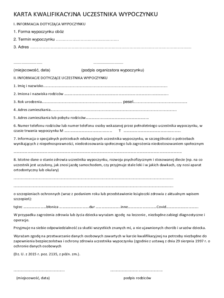 The Karta Kwalifikacyjna Uczestnika Wypoczynku is a critical form necessary for children participating in vacation camps. This document plays a significant role in ensuring the health and safety of participants, as it collects essential health data. Proper management of this form addresses health and caregiving concerns, making it indispensable for both parents and camp organizers.