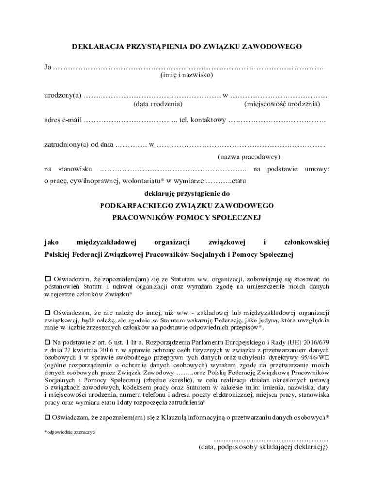 Any employee working in Poland who wishes to join the Podkarpacki Związek Zawodowy can fill out this form. It is specifically designed for individuals seeking to declare their membership with the union.