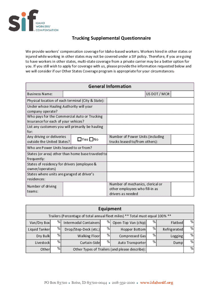 The Trucking Supplemental Questionnaire is a business form used by trucking companies to apply for workers' compensation coverage in Idaho.