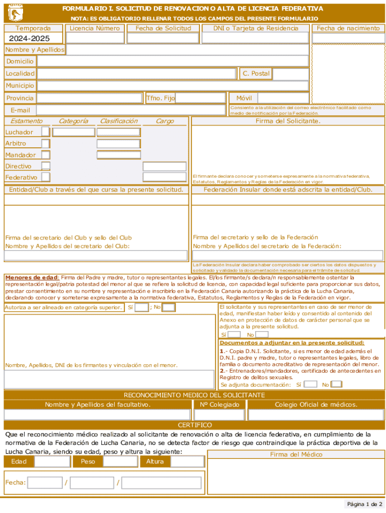 El FORMULARIO DE SOLICITUD DE LICENCIA DE LA FEDERACIÓN ESPAÑOLA es un documento esencial utilizado para solicitar o renovar una licencia dentro de la federación. Su propósito es garantizar que los solicitantes cumplan con los requisitos necesarios y puedan participar en las actividades organizadas por la federación. Este formulario es fundamental para aquellos que buscan formalizar su vínculo con la federación y obtener autorización para participar en eventos oficiales.