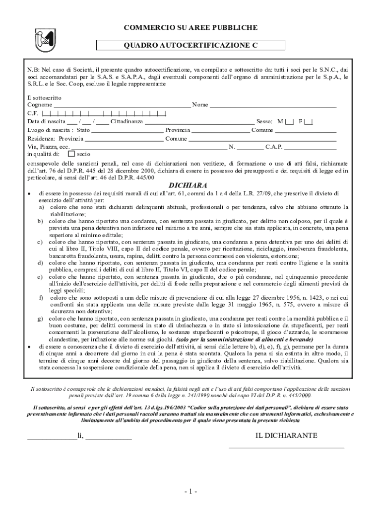 Il modulo di autocertificazione per il commercio su aree pubbliche è un documento essenziale per le persone fisiche e giuridiche che desiderano operare in spazi pubblici. Questo modulo consente di attestare la propria idoneità legale e morale per esercitare attività commerciale. Ogni imprenditore, sia esso un piccolo artigiano o un grande rivenditore, deve compilare questo modulo per garantire la compliance legale e per facilitare l'accesso al mercato.