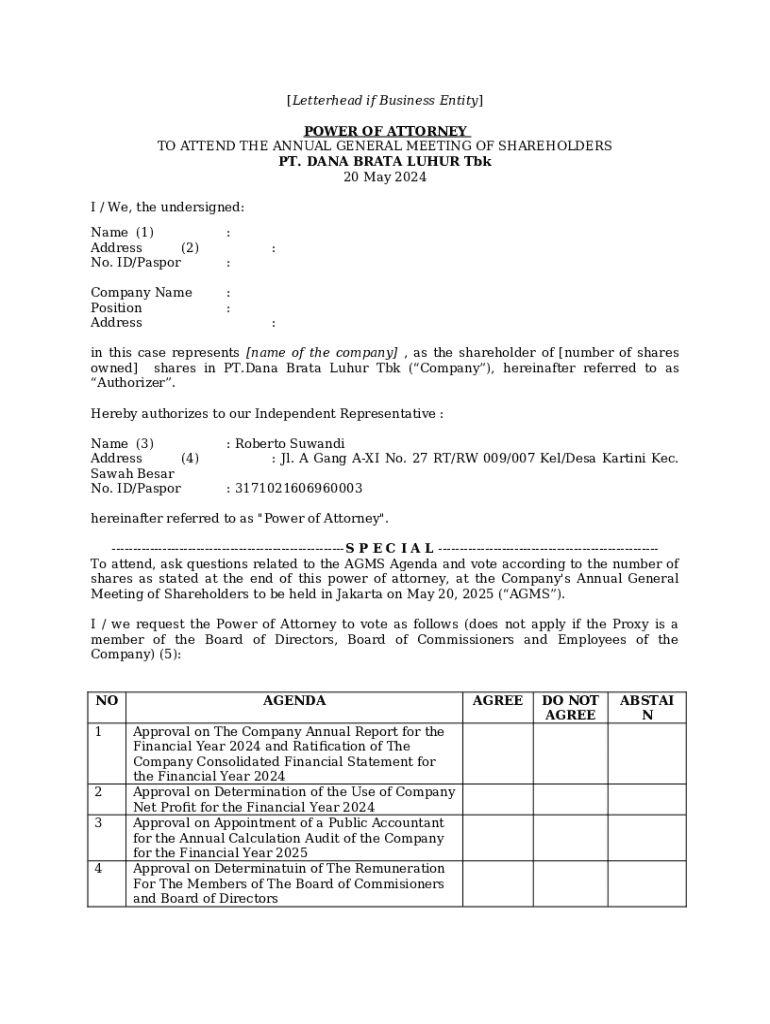 The Power of Attorney for AGM should be submitted to PT. Dana Brata Luhur Tbk before the scheduled date of the Annual General Meeting to ensure the representative can participate.
