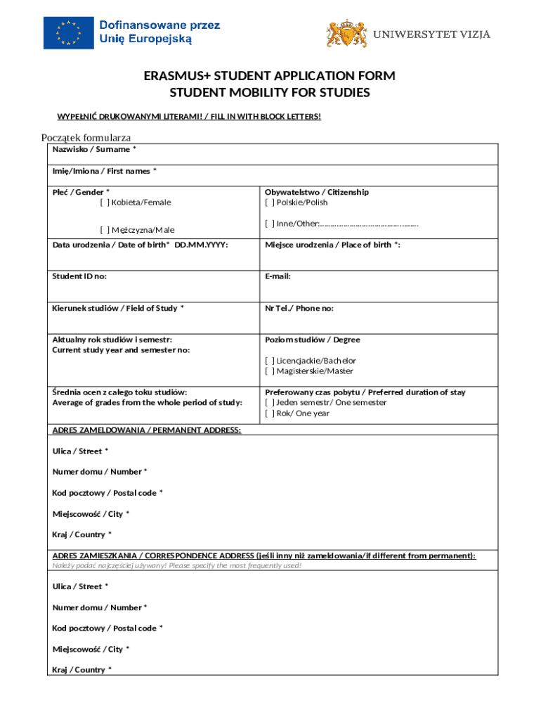 The Erasmus+ Student Application Form serves as a vital component of the Erasmus+ mobility program for studies. This application is essential for students seeking to enroll in the program and study abroad. It includes mandatory fields, clearly marked with an asterisk, that must be filled for successful submission.