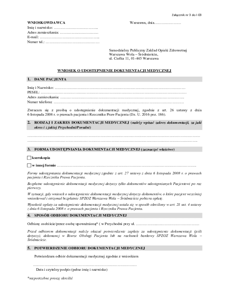 The Medical Records Request Form includes several fillable fields that gather vital information. Required fields such as 'Imię i nazwisko', 'Adres zamieszkania', and 'PESEL' are essential for identifying the patient and their records. Additionally, options for the preferred method of receiving medical documentation are clearly outlined within the form.