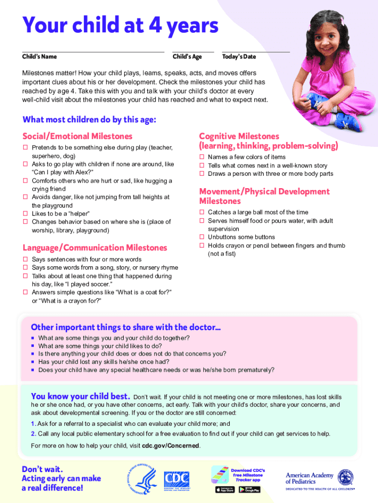 The Child Development Milestones Form is a medical history document used by parents or caregivers to track and record developmental milestones in 4-year-old children.