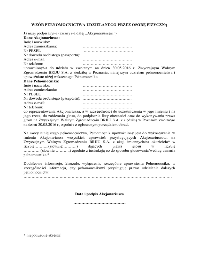 You will need to gather the shareholder's and proxy's personal details, including names, addresses, PESEL numbers, and the meeting date.
