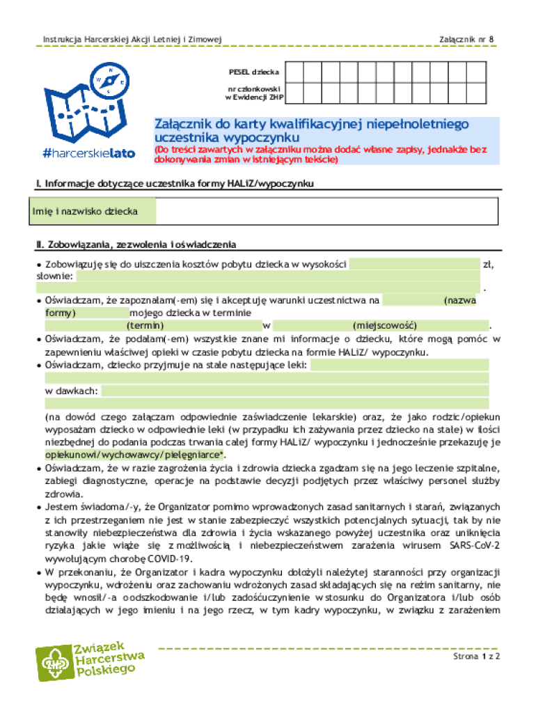 The Harcerska Akcja Letniej i Zimowej Attachment 8 is a crucial consent form utilized within the context of summer and winter camps in Poland. This document collects essential information regarding the child, including their personal details, medical information, and the necessary consent permissions from parents or guardians. It serves as a legal safeguard, ensuring compliance with safety regulations and fostering a secure environment for children at camp.