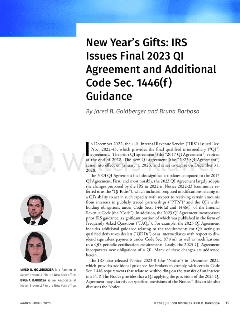 The 2023 QI Agreement is a crucial tax document issued by the IRS, aimed at guiding Qualified Intermediaries (QIs) in their compliance with withholding and reporting obligations. As a significant update from the 2017 version, it reflects the IRS's latest regulations and requirements, emphasizing the handling of tax matters related to Publicly Traded Partnerships (PTPs).