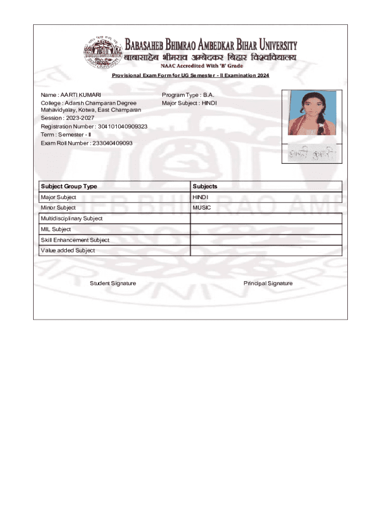 The Provisional Exam Form for UG Semester II Examination 2024 is essential for undergraduate students in India to register for their semester II exams. This form holds significant relevance in the academic journey, as it ensures a structured process for enrollment in various undergraduate courses. Key details required include the student's name, college, major subject, registration number, and exam roll number.