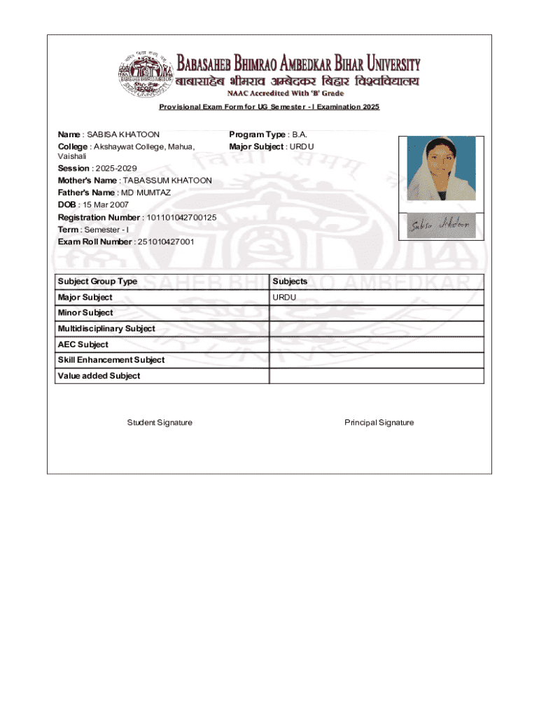 The Provisional Exam Form for UG Semester - I Examination 2025 is a critical document for undergraduate students at Akshaywat College, Bihar. This form serves not only as a registration tool but also plays a vital role in determining eligibility for examinations. Timely submission of the form is crucial to ensure that students can participate in the upcoming examinations, making it an important part of their academic journey.