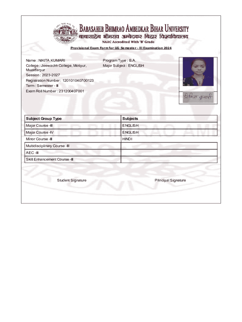 The Provisional Exam Form is crucial for undergraduate students, particularly for those enrolled in the B.A. program at Jeewachh College. This form serves several significant purposes in the examination process, ensuring students are adequately prepared and eligible for their assessments. By capturing essential student information, it plays a vital role in the overall academic journey.