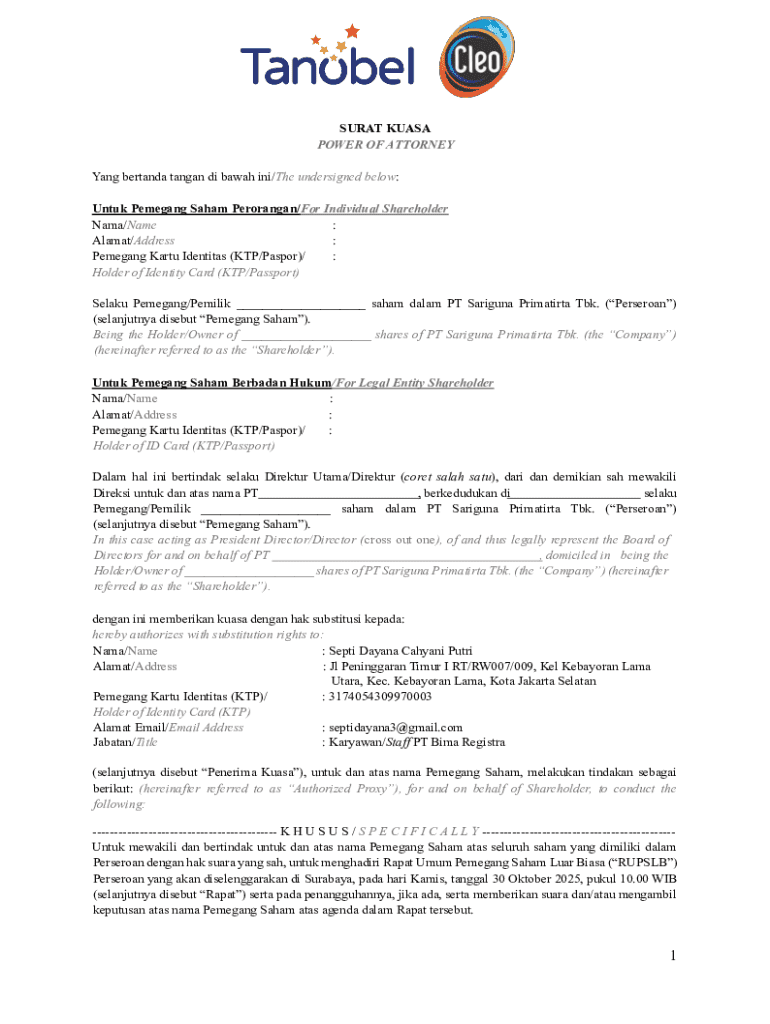 The Power of Attorney for Shareholder is a legal document used by shareholders in Indonesia to authorize a representative to act on their behalf in Extraordinary General Meetings (EGMS).