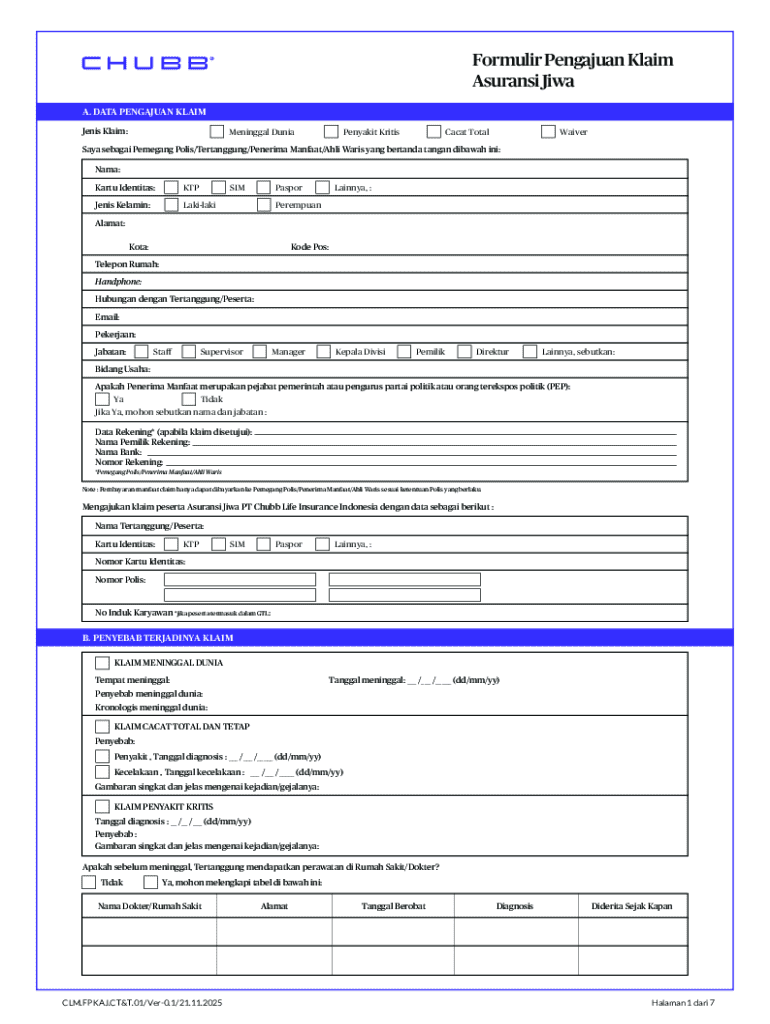 The Life Insurance Claim Form is an essential document used by policyholders and beneficiaries in Indonesia to submit claims for life insurance benefits under PT Chubb Life Insurance policies.