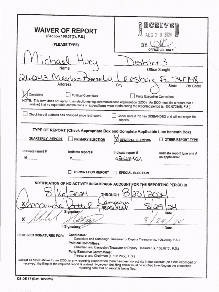 Candidates, political committees, and party executive committees that have made no contributions or expenditures during the reporting period are eligible to file the Florida Waiver of Report.