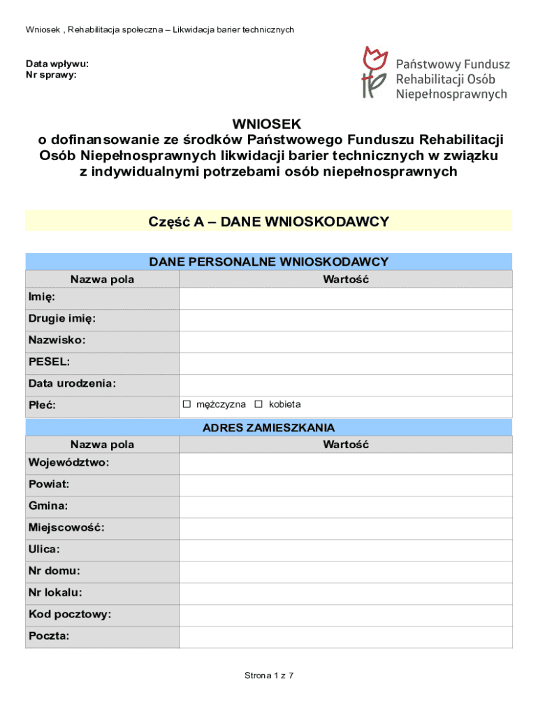 The Poland Social Rehabilitation Grant Application is a government form used by individuals with disabilities to request funding from the State Fund for Rehabilitation of Disabled Persons to eliminate technical barriers.