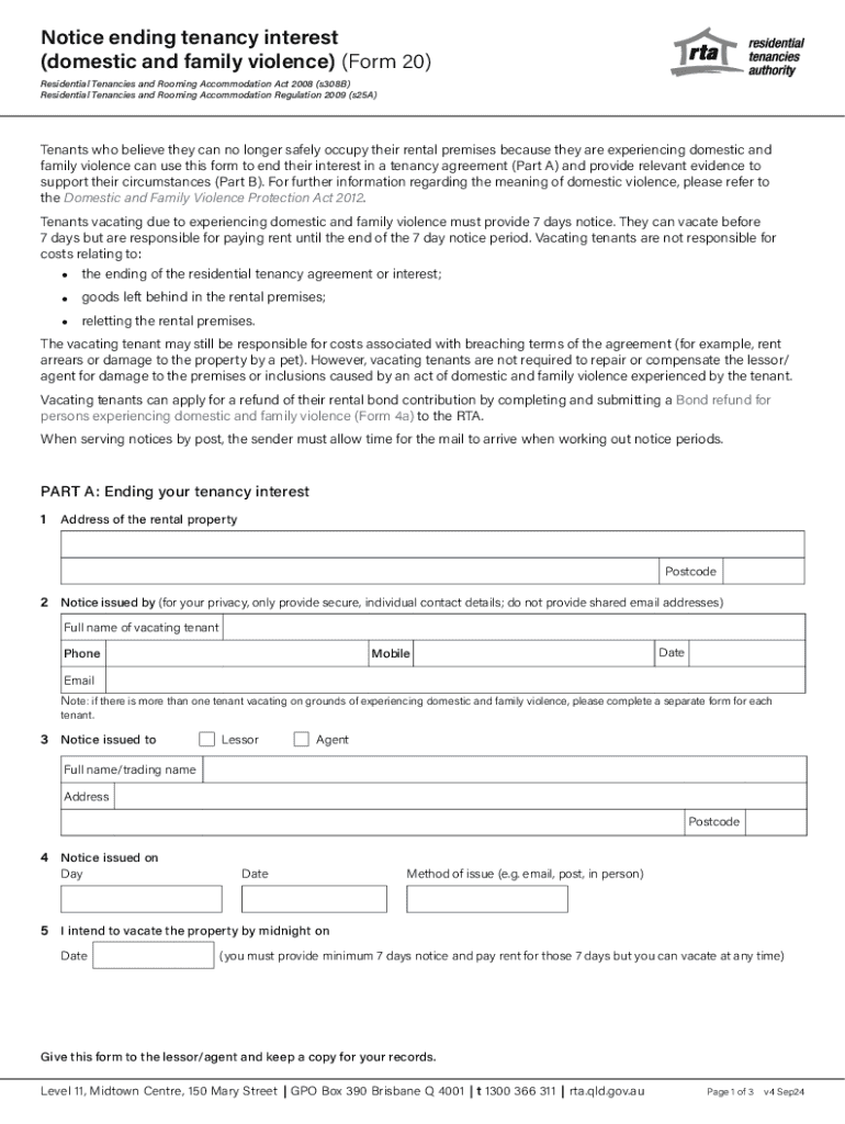 Form 20 is intended for tenants in Queensland experiencing domestic violence who need to terminate their tenancy agreement legally.
