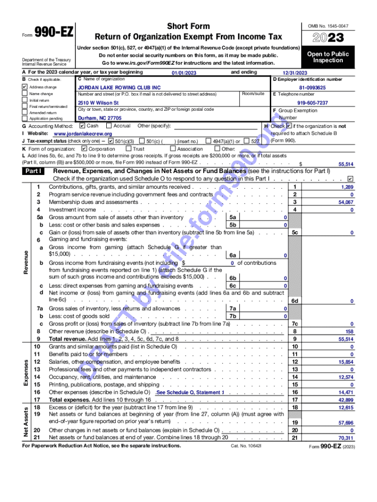 The Form 990-EZ 2023 is a tax document designed for tax-exempt organizations in the United States. It functions as a crucial tool for reporting financial activities to the IRS. This form includes detailed information such as gross revenue, total expenses, net assets, and program accomplishments. It is essential to understand that the Form 990-EZ is not a blank template but rather a completed tax return that provides valuable insights into a nonprofit's fiscal health.