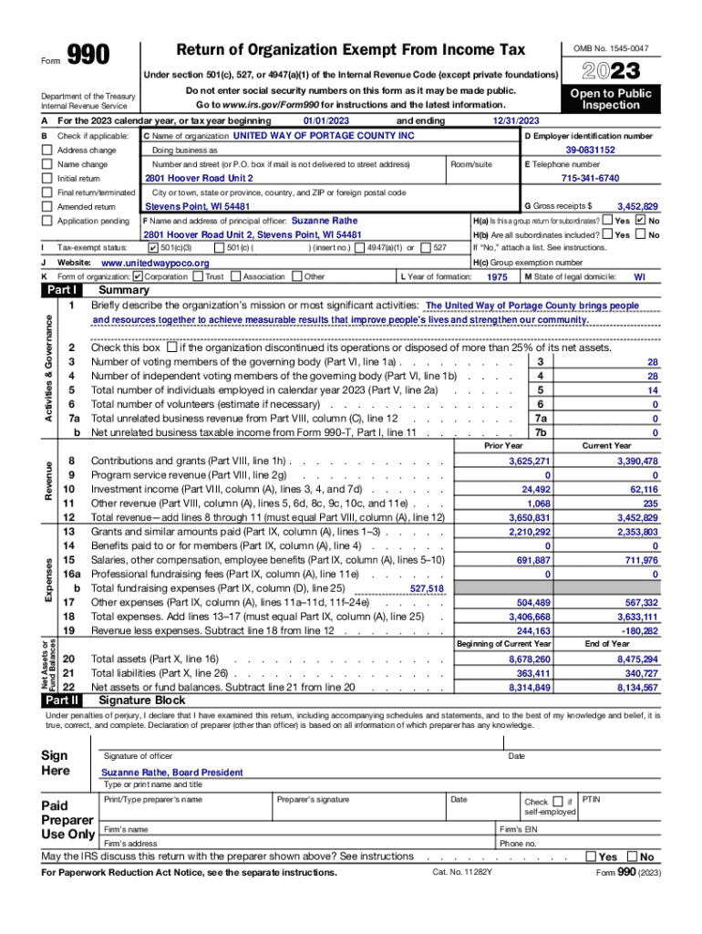 IRS Form 990 is a crucial annual tax return mandated by the U.S. Internal Revenue Service for tax-exempt organizations. This form plays a vital role in maintaining transparency and accountability for nonprofits, including the United Way of Portage County, Inc. It provides an overview of the organization's financial activities, revenue, expenses, and program accomplishments while ensuring compliance with IRS regulations. Understanding IRS Form 990 is essential for organizations to communicate their mission and governance effectively.
