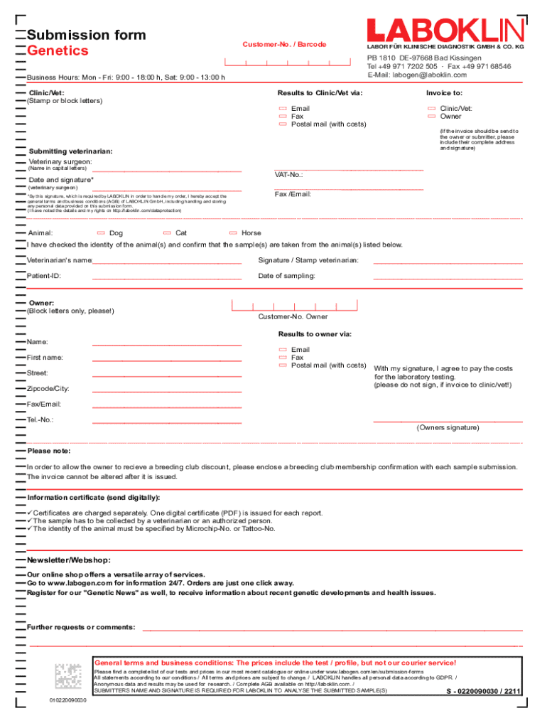 The Genetics Submission Form is a medical document used by veterinary surgeons and pet owners to submit samples for genetic testing.