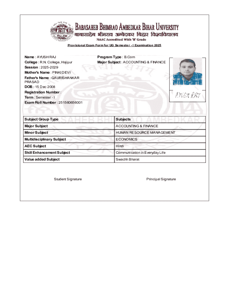 The Provisional Exam Form for UG Semester - I Examination 2025 is a crucial document for undergraduate students pursuing B.Com programs at R.N. College, Hajipur. This form plays a vital role in the examination process, facilitating registration and ensuring students' eligibility to sit for their exams. It is also a necessary step for students to assert their rights to appeal any examination-related decisions.