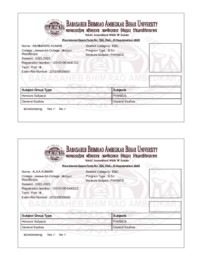 The Provisional Exam Form for TDC Part III Examination 2025 is a vital document for final year B.Sc. students at Jeewachh College, Motipur, Muzaffarpur. This form is essential for meeting graduation requirements, acting as a key component in the examination registration process.