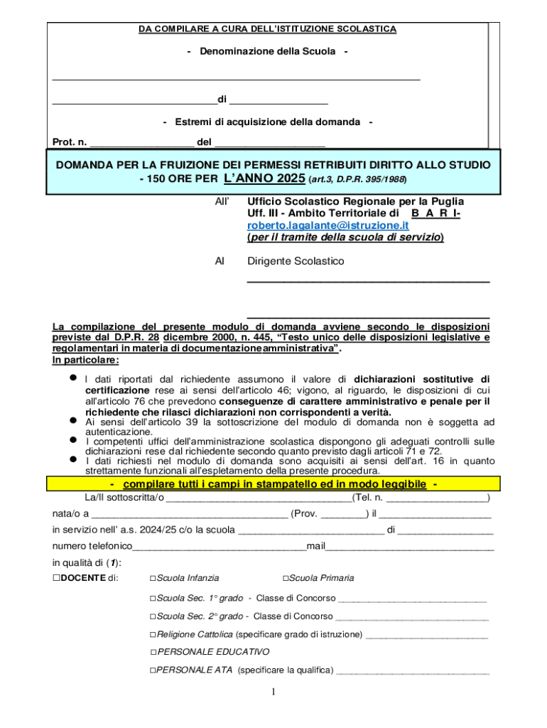 Il Modulo di Richiesta di Permesso di Studio della Scuola Italiana è un documento utilizzato dai dipendenti scolastici per richiedere 150 ore di permesso retribuito per motivi di studio.
