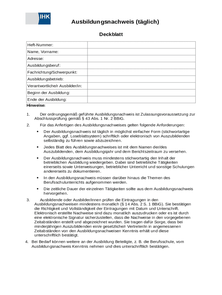 Das Formular muss zum Ende der Ausbildung eingereicht werden und ist für die Zulassung zur Abschlussprüfung erforderlich. Es sollte vollständig ausgefüllt und von dem Ausbilder unterzeichnet werden.