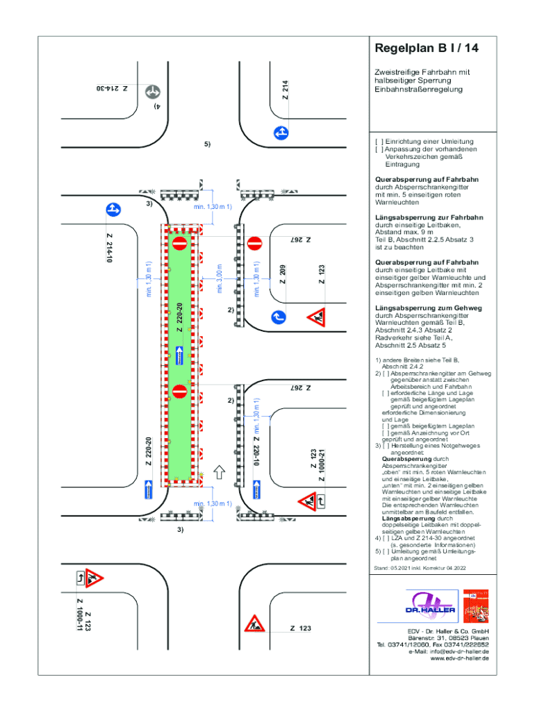 Regelplan B I / 14 Z 214Zweistreifige Fahrbahn mit halbseitiger Sperrung EinbahnstraenregelungZ 21430 4)[ ] Einrichtung einer Umleitung [ ] Anpassung der vorhandenen Verkehrszeichen gem Eintragung5)3)Querabsperrung