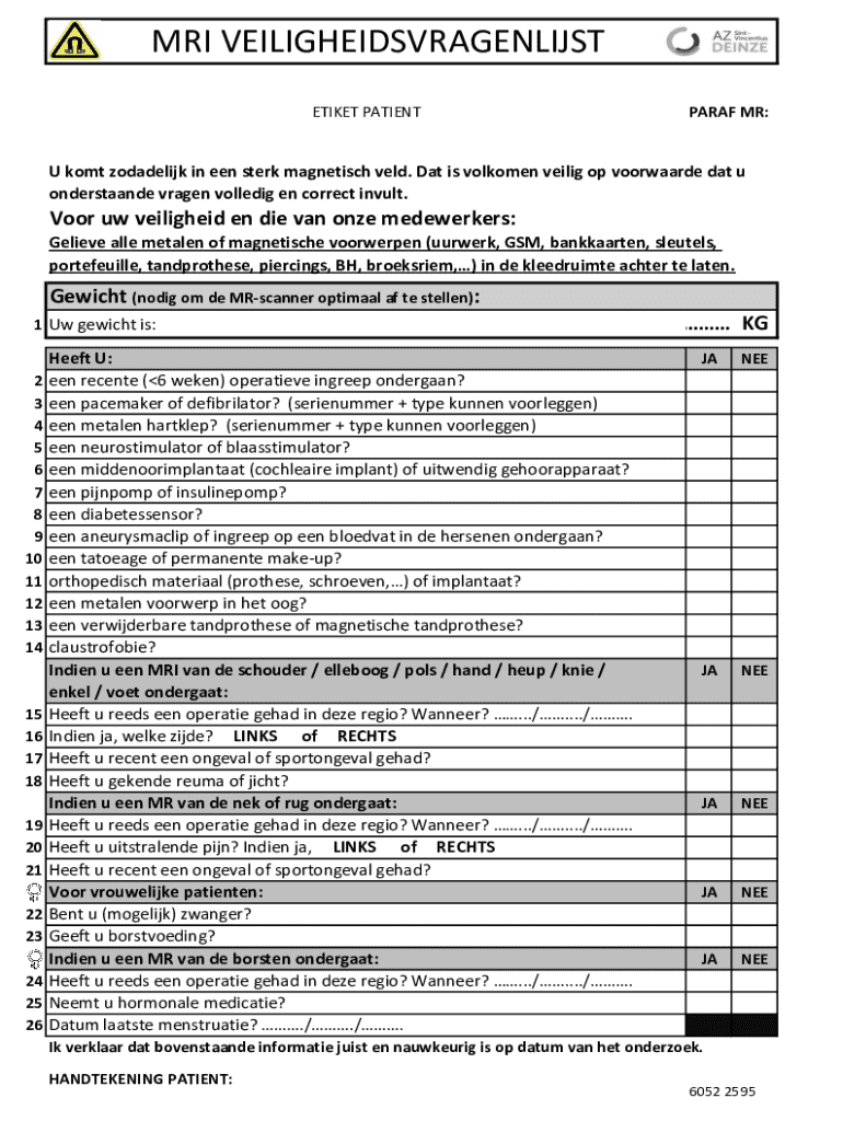 De MRI Safety Questionnaire moet worden ingevuld door elke patiënt die een MRI-scan ondergaat. Het is van cruciaal belang om deze informatie te verstrekken voor de veiligheid van de patiënt.