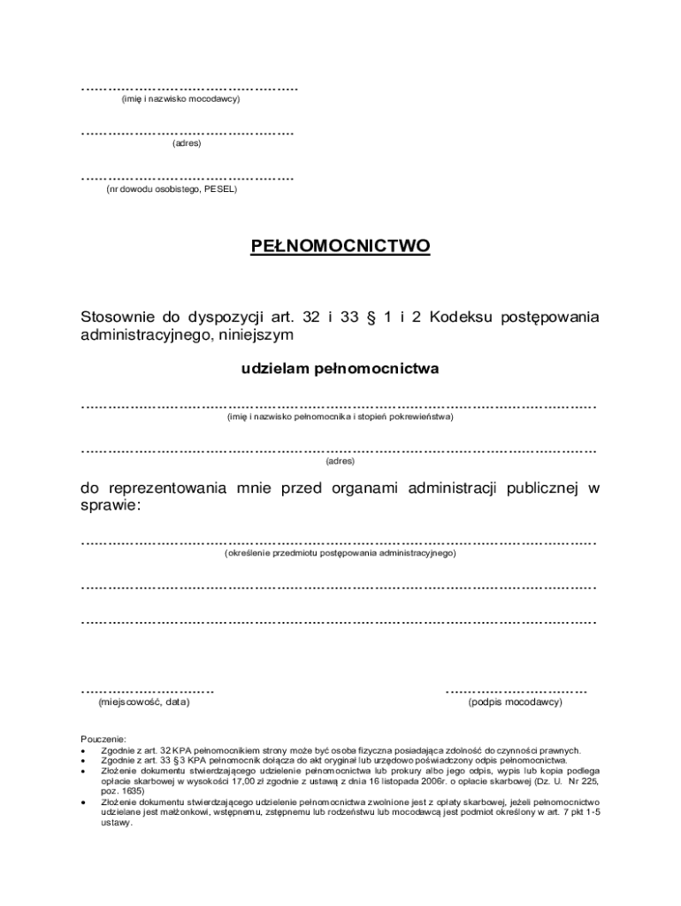 Anyone over the age of 18 who wishes to grant authority to another individual for administrative proceedings in Poland can use the Power of Attorney Form.