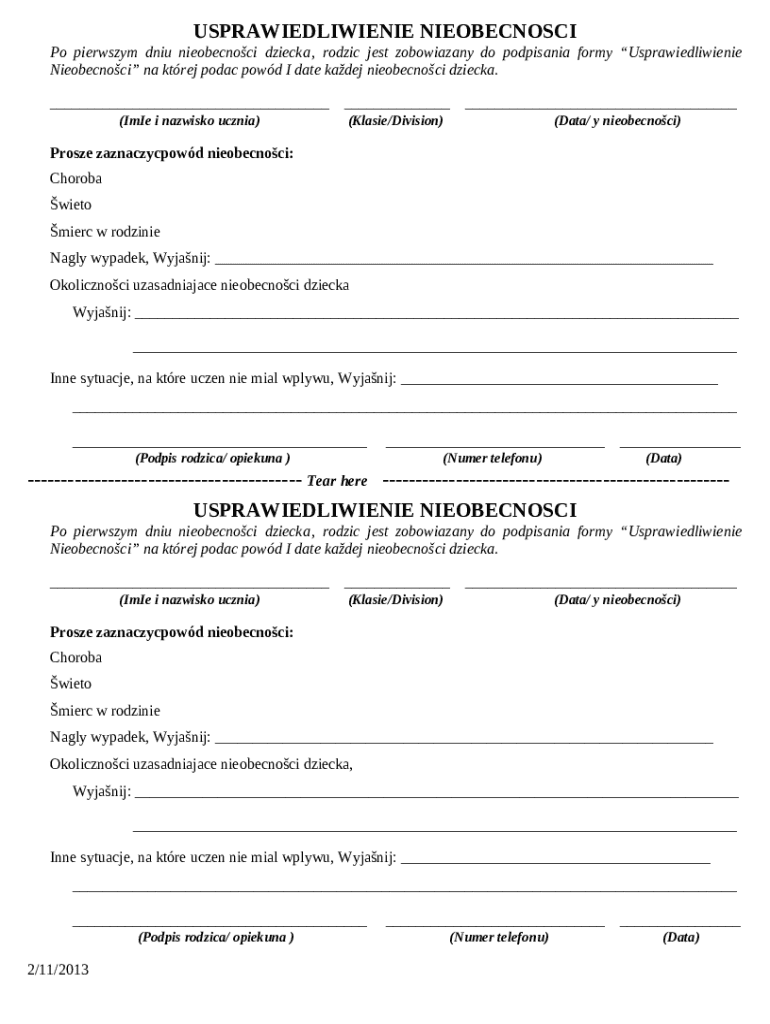 The Absence Justification Form is an essential document for parents and guardians in Poland, designed to formally explain and justify a student's absences from school. This form requires critical information, including the student’s name, class, date of absence, and the reason for the absence, which can encompass common situations such as illness or family emergencies. Its primary audience consists of parents and guardians needing to communicate a student's absence to the school authority.