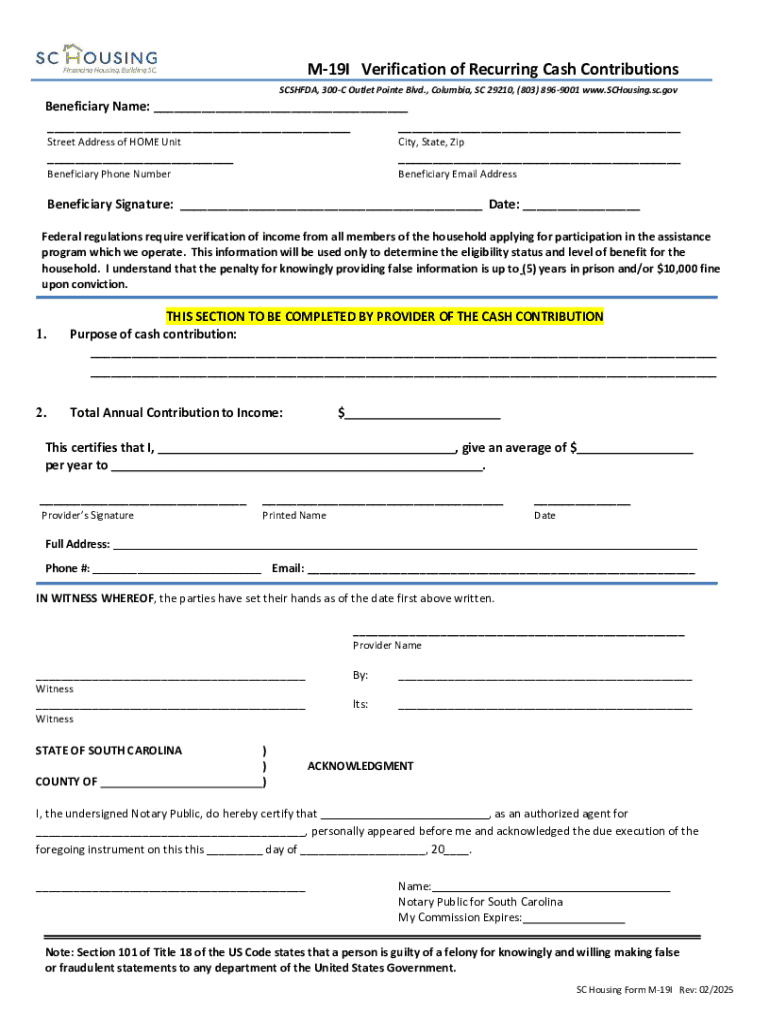 Individuals receiving housing assistance in South Carolina who can verify cash contributions from providers are eligible to complete and submit the SC Housing Form M-19I.