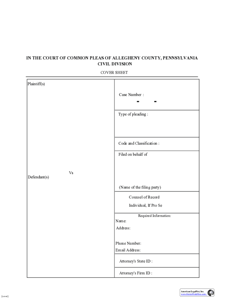 The Pennsylvania Civil Pleading Cover Sheet is a legal document used by plaintiffs and defendants in Allegheny County to provide essential case information for civil proceedings.