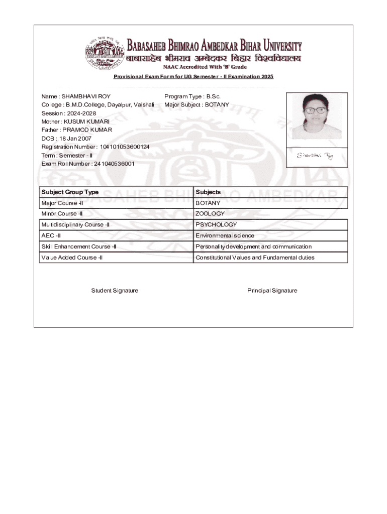 This form is utilized by undergraduate students from various programs and is typically required prior to the examination period, ensuring all necessary details are gathered for a smooth process. Keywords relevant to this form include "Provisional Exam Form 2025" and "UG Semester II Exam Form."