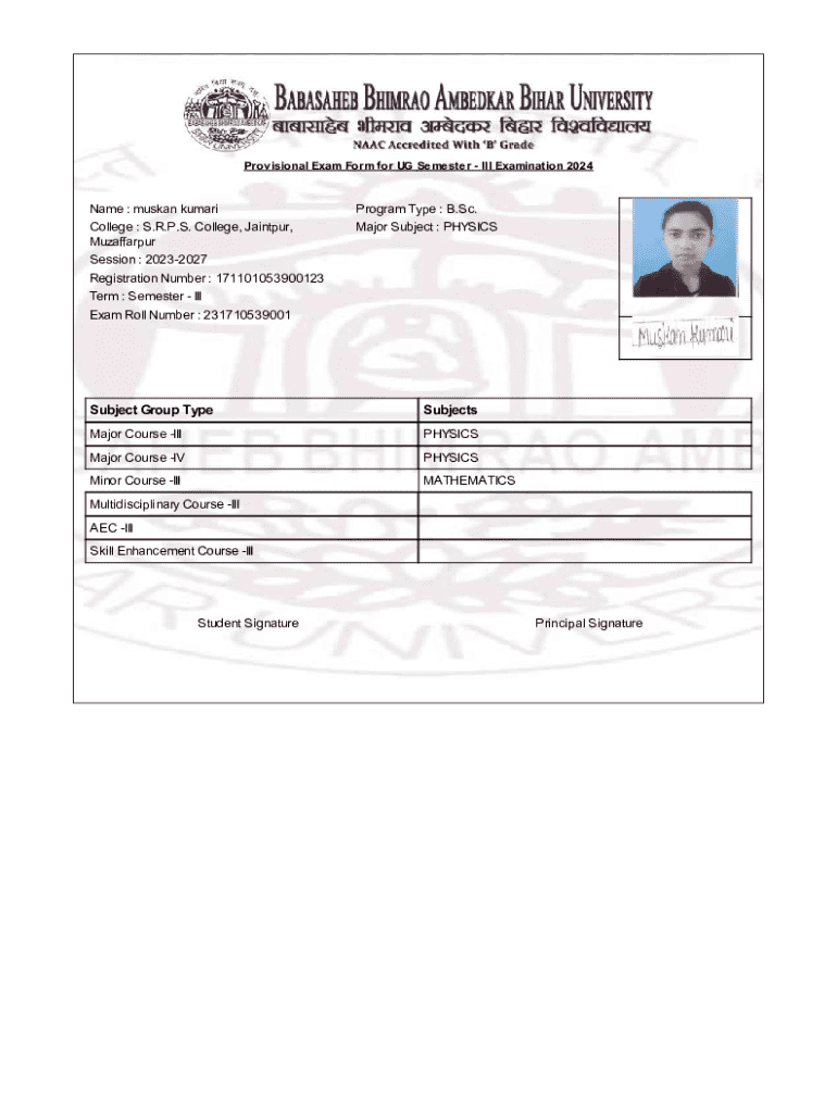 The Provisional Exam Form for UG Semester III Examination 2024 is a crucial document for undergraduate students at S.R.P.S. College. This form enables students to register for their semester III examinations, ensuring their eligibility for degree completion. It requires essential personal information, including registration numbers and exam details, which must be accurately filled out to facilitate a smooth registration process.
