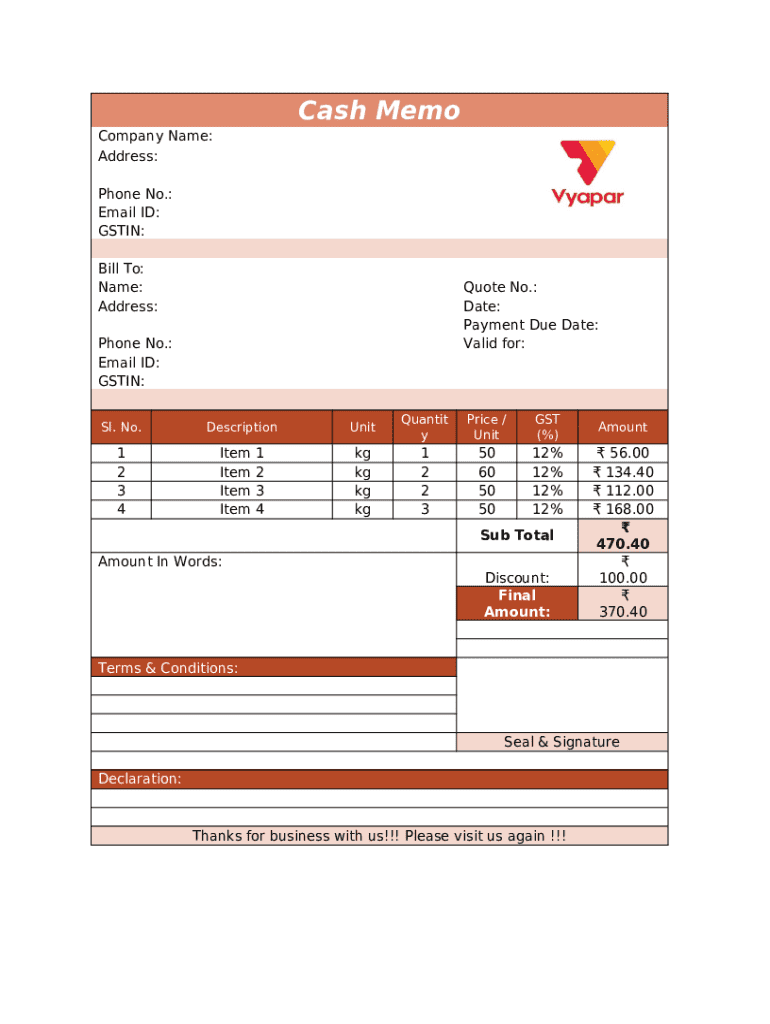 You typically need company details, recipient information, item descriptions, quantities, and pricing to accurately fill out the Cash Memo.